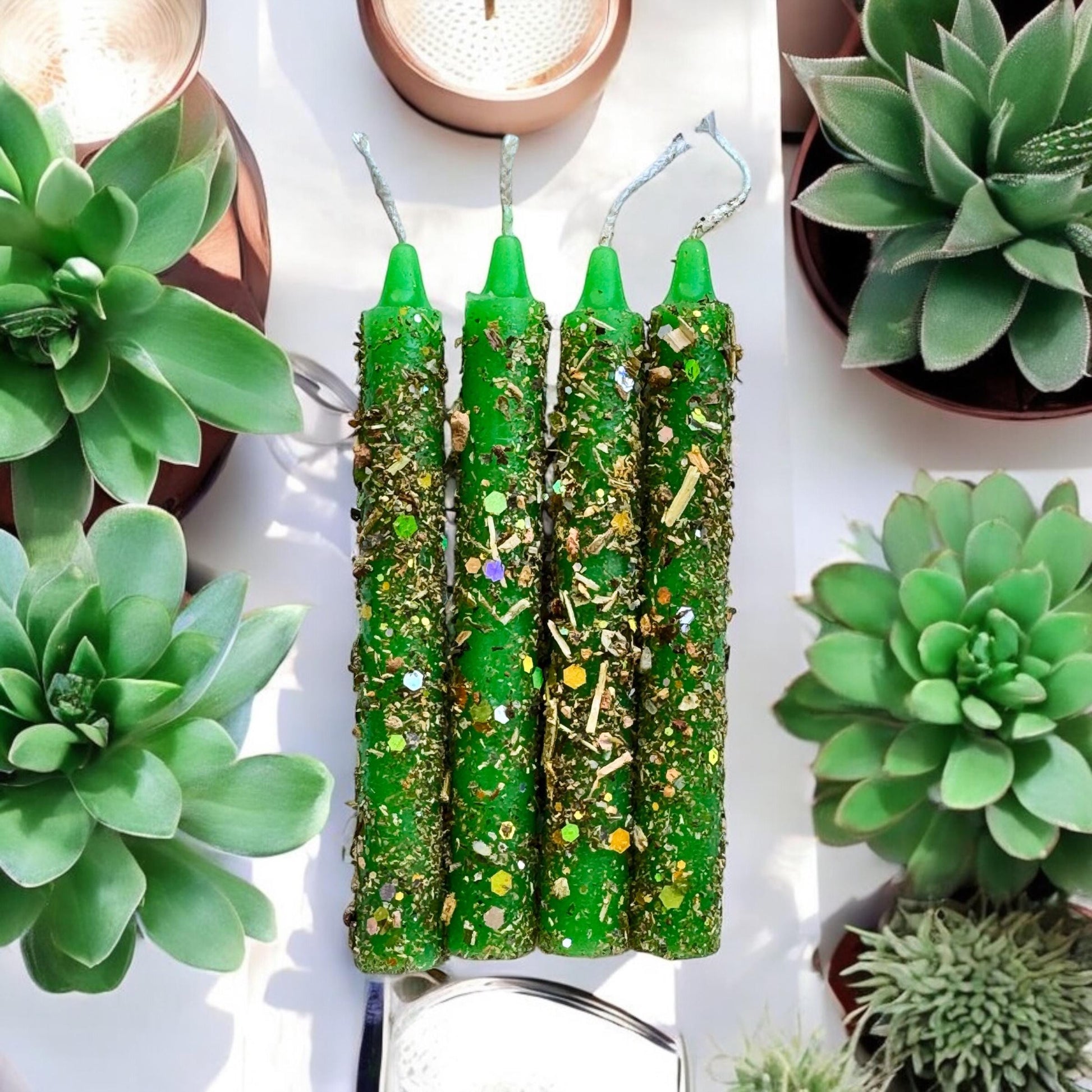 Each candle in this set represents a distinct aspect of prosperity work—attraction, stability, growth, and momentum—allowing you to layer intentions or work with them individually according to your ritual needs.